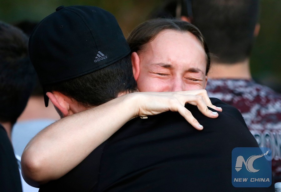 Mourners hug after placing flowers on a makeshift memorial for the victims of Marjory Stoneman Douglas High School shooting in Parkland, Florida on Feb. 15, 2018. (Xinhua/AFP)