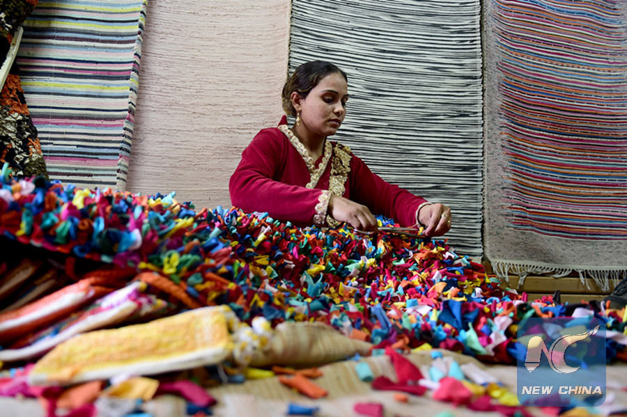 An Egyptian woman makes a carpet from recycled materials at a workshop in Mokattam area of Cairo, Egypt, on March 7, 2018. The Association for the Protection of the Environment (APE) set up the workshop as an income generating program aimed to empower women of the Zabbaleen (garbage collector in Arabic) community to better their lives. (Xinhua/Zhao Dingzhe)