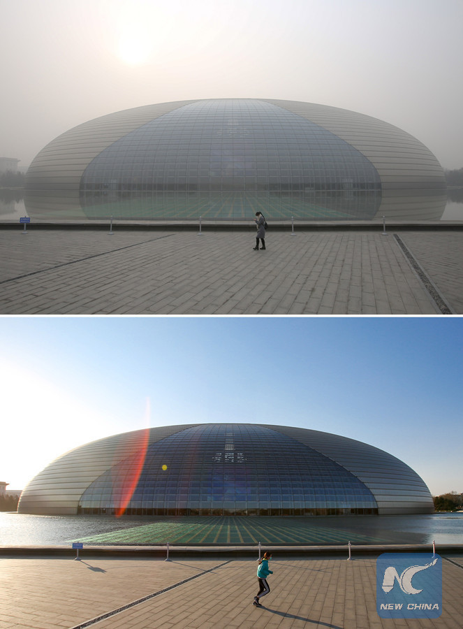 The combo photo taken on Dec. 21 (up) and Dec. 22, 2016 (down) shows the National Center for the Performing Arts in Beijing, capital of China. Beijing lifted a red alert for air pollution on Wednesday night as cold air dispersed the smog that affected the city for days. (Xinhua/Zhang Cheng)