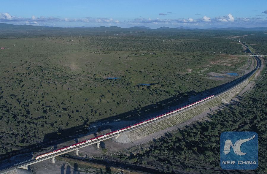 A train carries out a test run on Kenya's Mombasa-Nairobi Standard Gauge Railway (SGR) on May 25, 2017. (Xinhua/Chen Cheng)