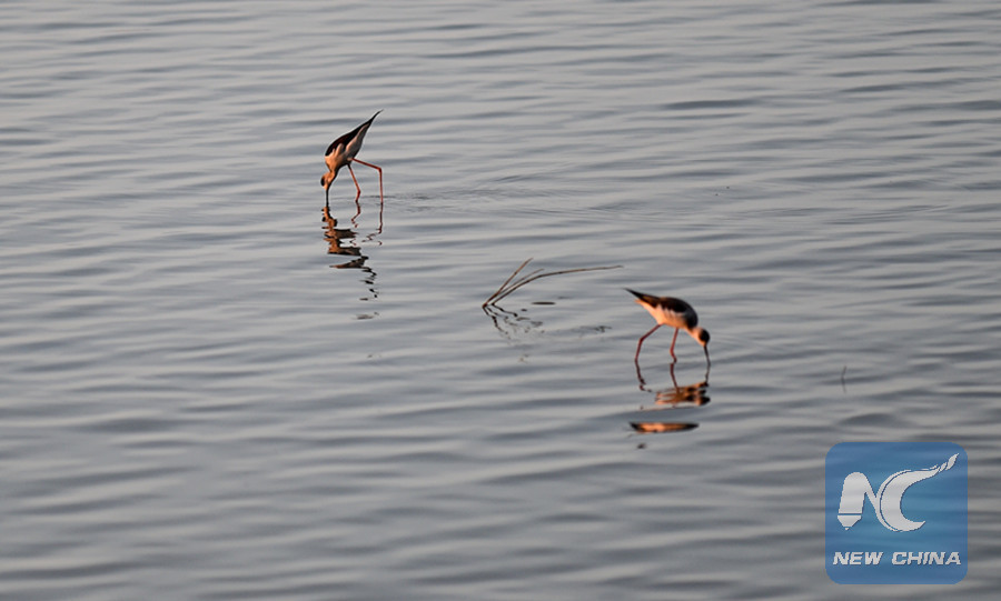 Black-winged Stilts forage at Shenzhen Bay, south China's Guangdong Province, Nov. 9, 2017. (Xinhua photo/Mao Siqian)