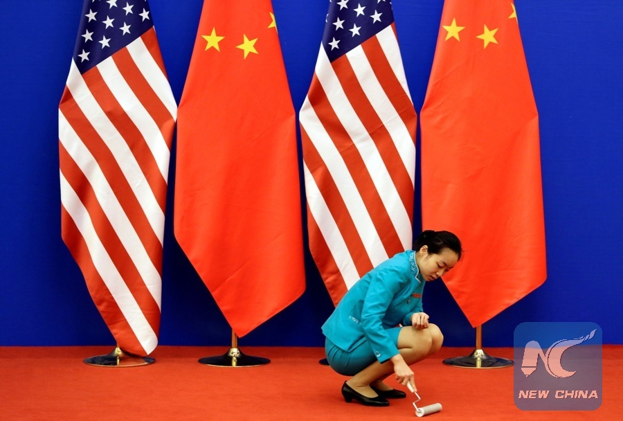 An attendant cleans the carpet next to U.S. and Chinese national flags before a news conference for the 6th round of U.S.-China Strategic and Economic Dialogue at the Great Hall of the People in Beijing, July 10, 2014. (Xinhua/REUTERS)