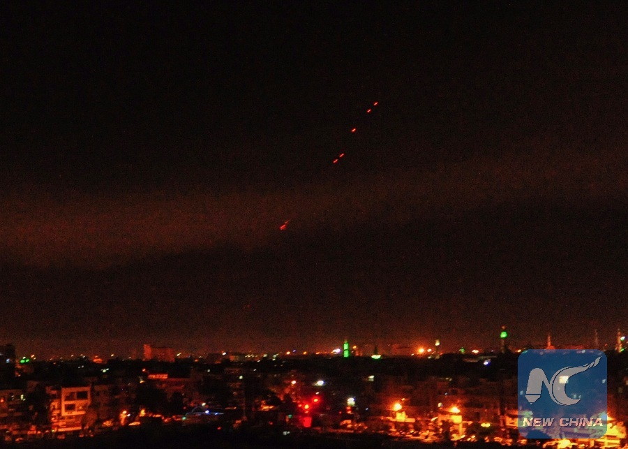 Surface-to-air missiles are seen over Syria's capital Damascus on April 14, 2018, as the Syrian air defenses were responding to U.S. attacks. (Xinhua/Ammar Safarjalani)