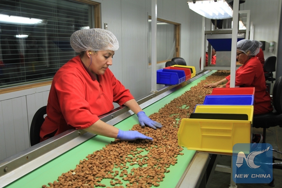 Workers are processing almonds at a processing plant of Travaille and Phippen, Inc., an almond growing and processing enterprise, in Modesto, the United States, on April 25, 2018. (Xinhua/Gao Shan)