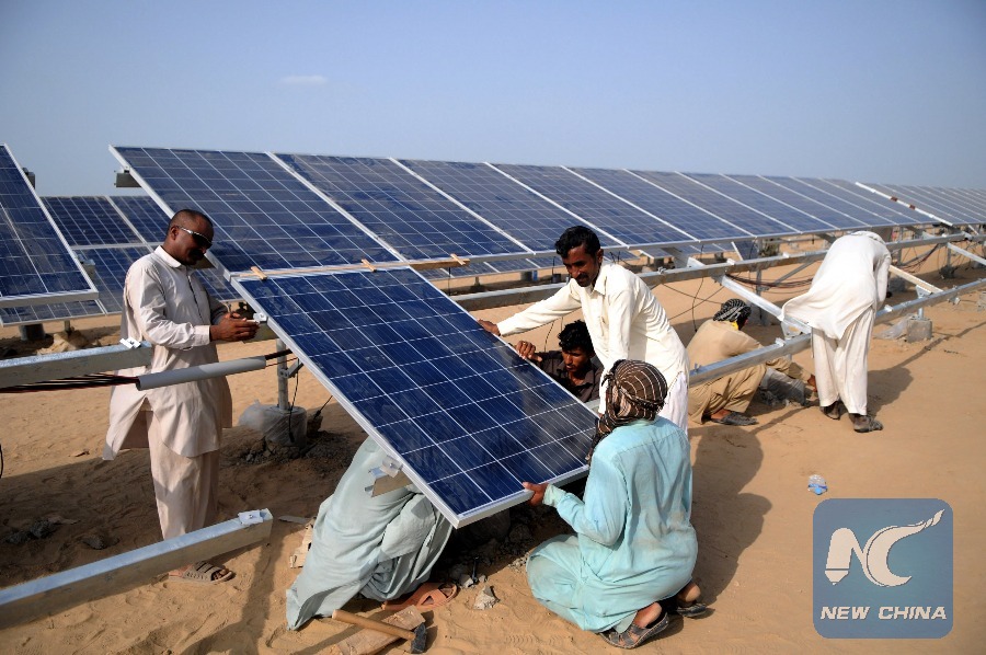 Pakistani workers install a solar photovoltaic panel at Zonergy 900 MW Solar Project in Bahawalpur, Pakistan, Aug. 27, 2015. The 1.5-billion-U.S.-dollar Zonergy 900 MW Solar Project is a power project under the framework of China-Pakistan Economic Corridor (CPEC). The project is being developed in three phases. Before the end of this year, 300 MW will be added to Pakistan's national grid. The first 50 MW of the project is near completion and is going to be energized soon, according to Zonergy Company Limited. (Xinhua/Ahmad Kamal)
