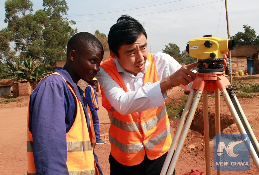 A Chinese worker and his local counterpart go about their construction work of the Entebbe-Kampala Expressway, in Wakiso district, Uganda, Nov. 17, 2017. The Entebbe-Kampala Expressway, which is under construction by China Communications Construction Company Ltd (CCCC), is a 350 million U.S. dollar project linking Uganda's capital Kampala to Entebbe International Airport. (Xinhua/ Zhang Gaiping)