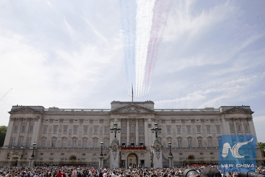 The Red Arrows fly over Buckingham Palace during the Trooping the Colour ceremony to mark Queen Elizabeth II's 92nd birthday in London, Britain on June 9, 2018. (Xinhua/Tim Ireland)