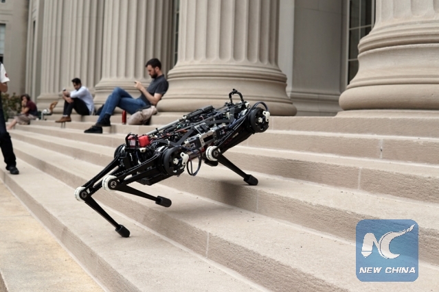 LOS ANGELES, July 5 (Xinhua) -- Thanks to two new algorithms, MIT's Cheetah 3 robot doesn't need to see to leap and gallop across rough terrain, climb a staircase littered with debris, and quickly recover its balance when suddenly yanked or shoved, according to a new video MIT shared on Thursday.