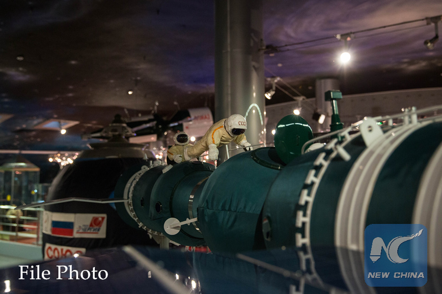 Photo taken on April 7, 2016 shows the model of Soyuz-4 and Soyuz-5 Spacecraft docking at the Museum of Cosmonautics in Moscow, Russia. (Xinhua/Bai Xueqi)