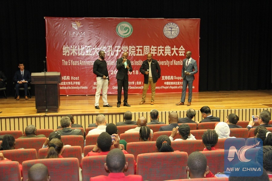 Namibian artists sing Chinese song at the 5th anniversary celebration of the Confucius Institute (CI) at University of Namibia in Windhoek, capital of Namibia, on July 20, 2018. (Xinhua/Wu Changwei)
