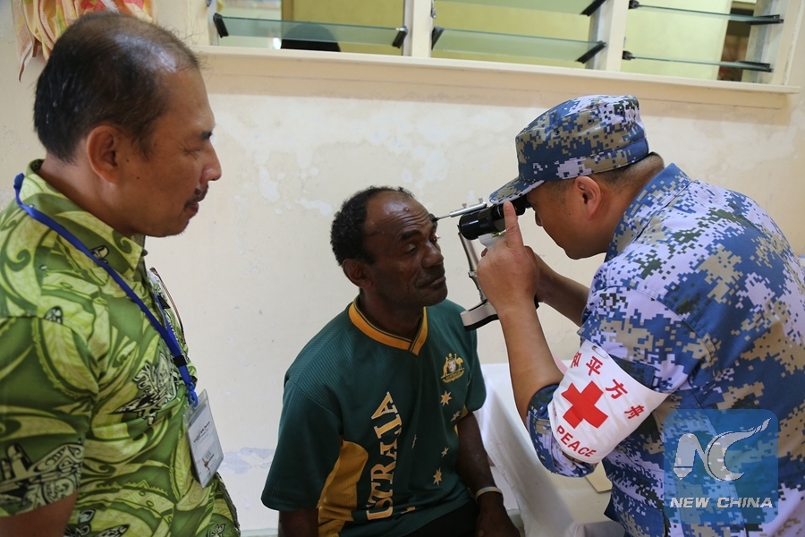 SUVA, Aug. 8 (Xinhua) -- A medical team from the visiting Chinese naval hospital ship Ark Peace was transported on Tuesday by a naval helicopter to Vatulele, an island more than 100 km away from Fiji's capital Suva, to offer free medical services to the islanders, who spoke highly of the Chinese military doctors' services.