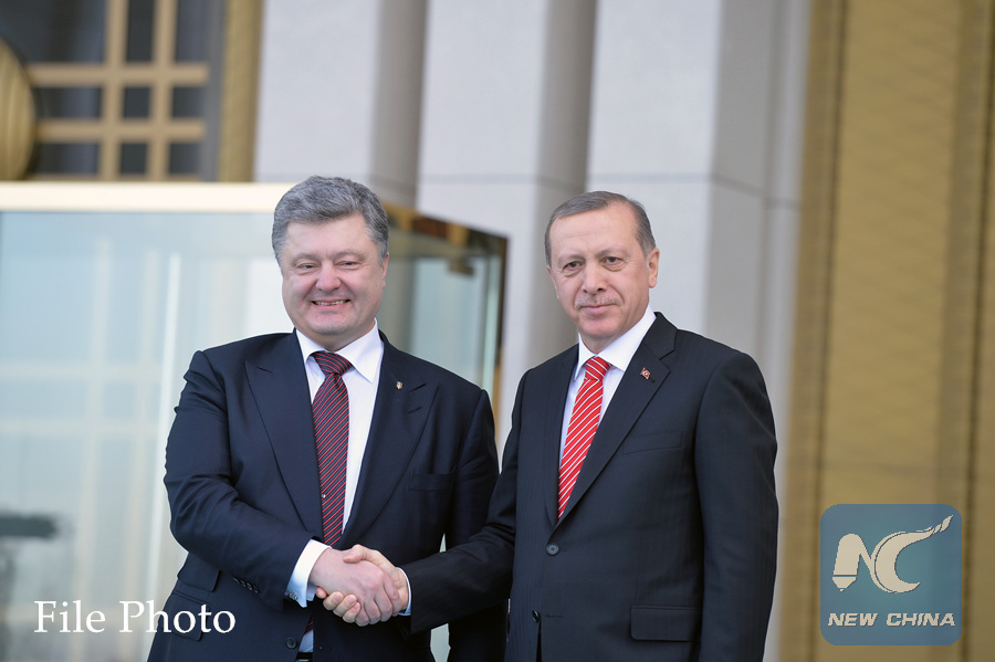 Turkish President Recep Tayyip Erdogan (R) shakes hands with visiting Ukrainian President Petro Poroshenko at the Presidential Palace in Ankara, capital of Turkey, on March 9, 2016. (Xinhua/Mustafa Kaya)