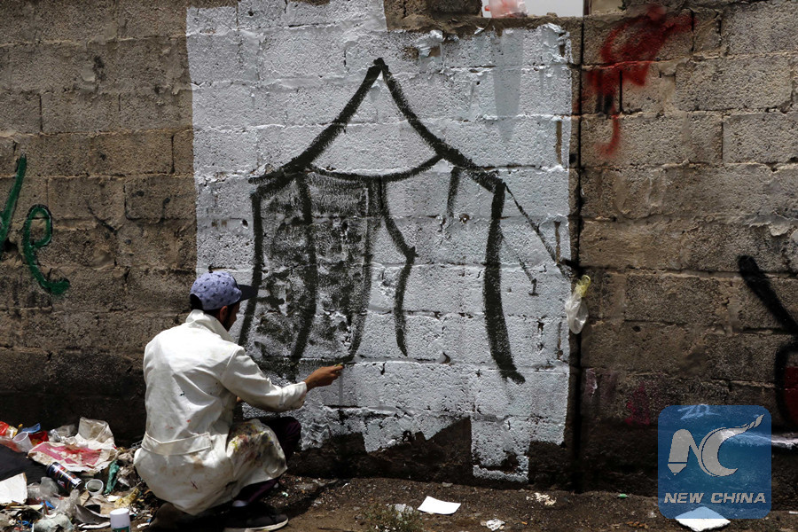 A Yemeni artist works on graffiti on a wall about difficulties Yemeni displaced people face after they fled their homes due to the ongoing conflicts, at a street in Sanaa, Yemen, on August 16, 2018. (Xinhua/Mohammed Mohammed)