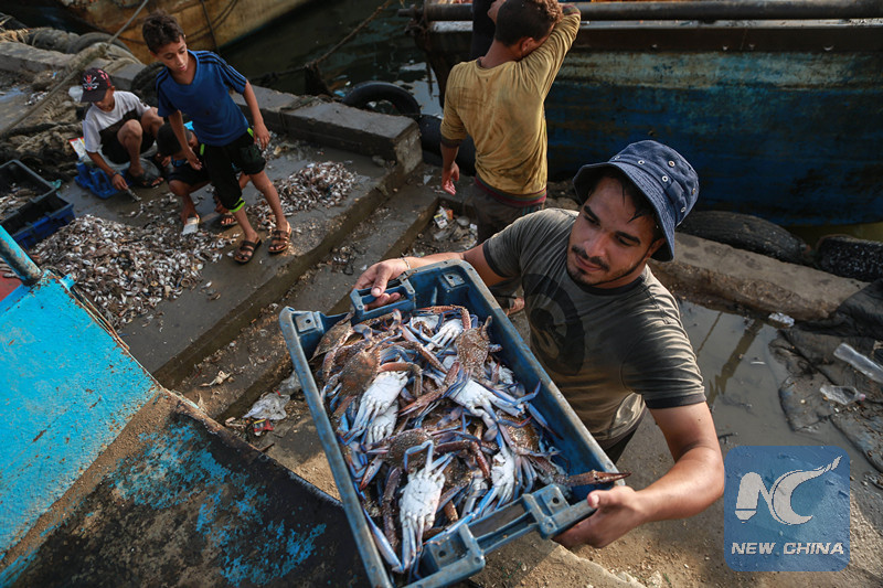 A Palestinian fisherman displays his catch at the seaport in Gaza, in Gaza City, on Sept. 17, 2018. (Xinhua/Stringer)