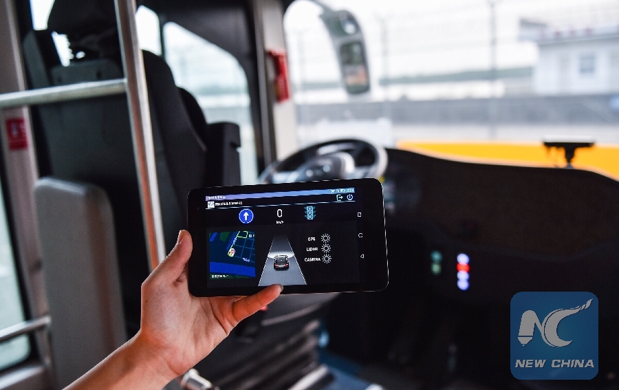 File Photo: A technician shows the monitoring equipment of self-driving buses in Shenzhen, south China's Guangdong Province, Nov. 30, 2017. (Xinhua/Mao Siqian)