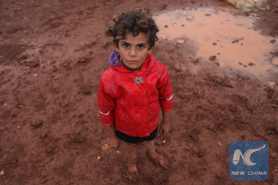 File Photo: A displaced Syrian child poses for a photograph in a flooded refugee camp in the Idlib countryside, northwestern Syria, on Oct. 25, 2018. (Xinhua/AFP)