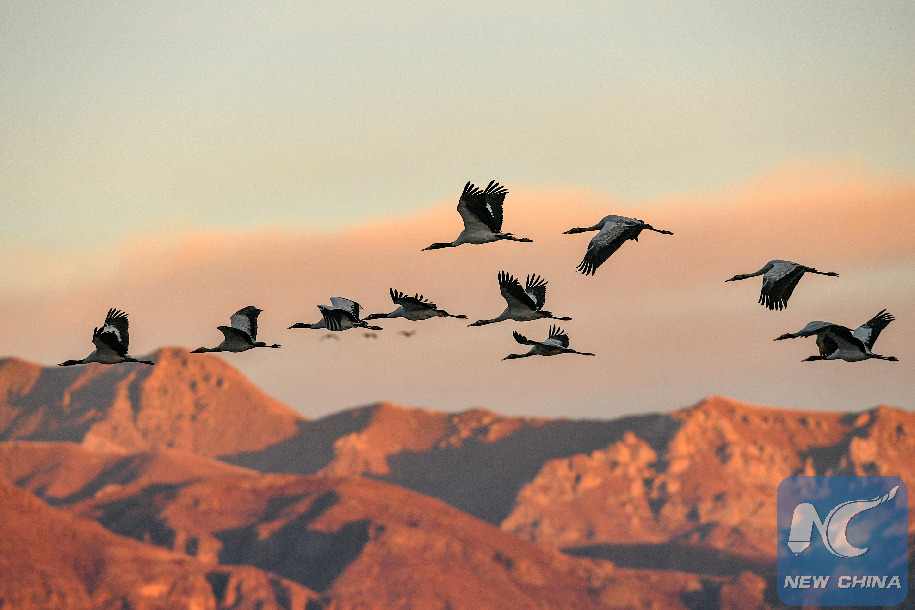 Black-necked cranes fly over the natural reserve for black-necked crane in Lhunzhub County, southwest China's Tibet Autonomous Region, Jan. 1, 2019. Black-necked cranes are often seen in Tibet's river valleys and the region's barley and wheat fields in winter. With an estimated population of around 10,200, the species is classified as "vulnerable" by the International Union for Conservation of Nature (IUCN). Tibet is home to about 80 percent of the world's total population of the bird. Thanks to efforts made by locals and authorities, these exhausted birds, after flying for over 1,000 km, don't have to face hunger, pesticide, or poachers. Instead, they can now easily find pollutant-free highland barley and wheat left by farmers. (Xinhua/Zhang Rufeng) XINHUA PHOTOS OF THE DAY