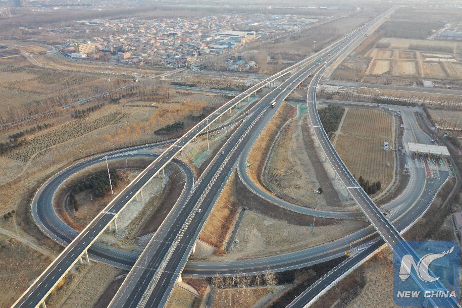 Aerial photo taken on Jan. 1, 2019 shows the Xingyan part of the Beijing-Chongli Expressway in Beijing, capital of China. The 42-km highway starting from Beijing's northwestern Sixth Ring Road to the outlying district of Yanqing was open to traffic on Tuesday. The Beijing-Chongli highway, which runs through the mountains in northern Beijing to Chongli, a ski event venue for the 2022 Winter Olympic Games, will be an important part of the Olympic Games infrastructure. (Xinhua/Xing Guangli) XINHUA PHOTOS OF THE DAY