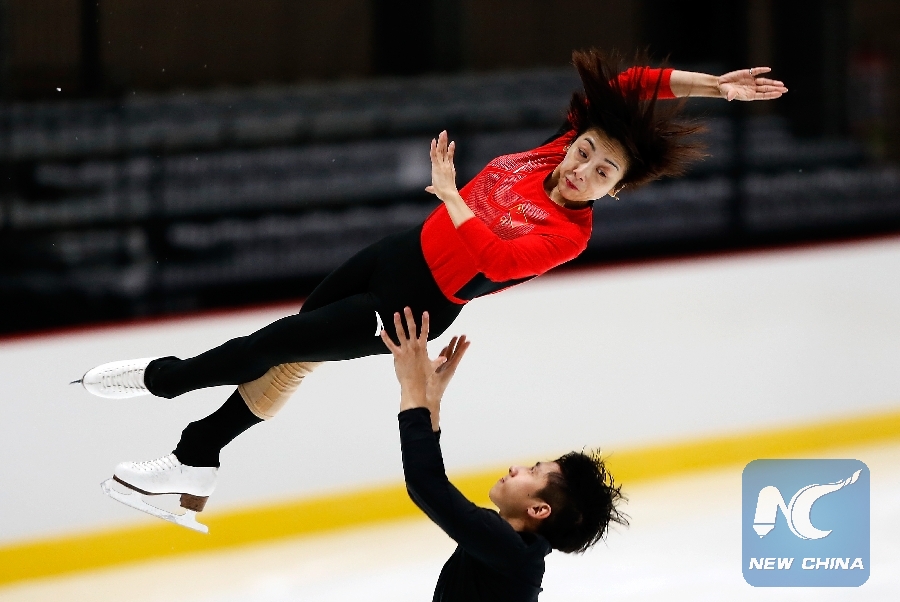 Chinese Figure skaters Sui Wenjing (Top) and Han Cong practice during a training session on January 9, 2019. (Xinhua/Wang Lili)