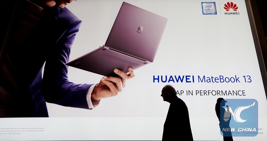 Visitors walk by an advertising screen of Huawei during the Consumer Electronics Show (CES) in Las Vegas, the United States, Jan. 8, 2019.(Xinhua/Li Ying)