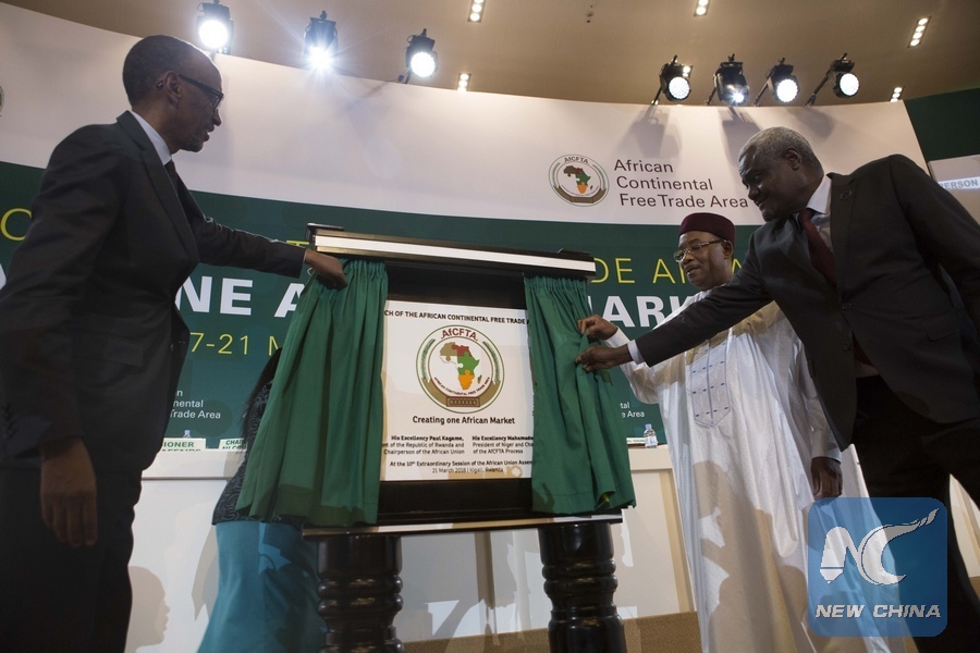 Chairman of the African Union (AU) and Rwandan President Paul Kagame (L), President of Niger Mahamadou Issoufou (C) and Chairperson of AU Commission Moussa Faki Mahamat (R) unveils a plaque of the African Continental Free Trade Area (AfCFTA) in Kigali, Rwanda on March 21, 2018. (Xinhua/Gabriel Dusabe)