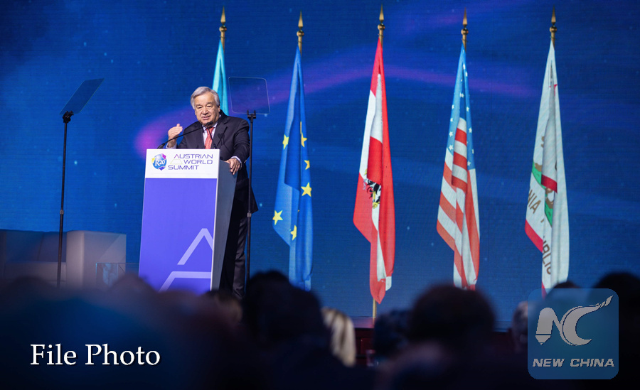 UN Secretary General Antonio Guterres gives a speech during the opening ceremony of the R20 Regions of Climate Action Austrian World Summit in Vienna, Austria, on May 28, 2019. (AFP PHOTO)
