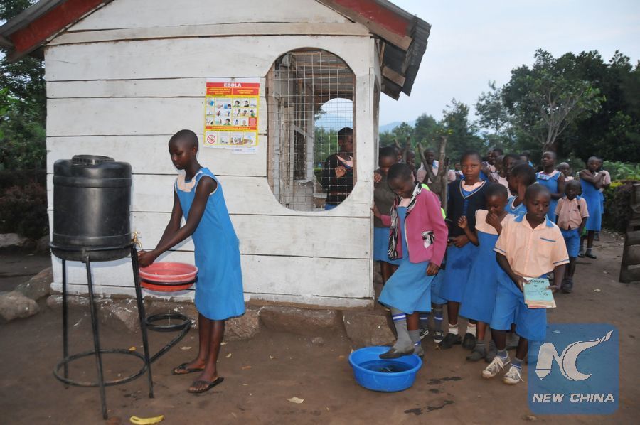 File photo shows pupils queue to wash their hands with chlorinated water to prevent the spread of Ebola at the St. John Kamasasa Primary School in Kasese district, Western Uganda, June 18, 2019. Uganda's Ministry of Health has so far registered three confirmed cases of Ebola a week after the deadly disease spread over the border from Democratic Republic of Congo. (Xinhua/Nicholas Kajoba)