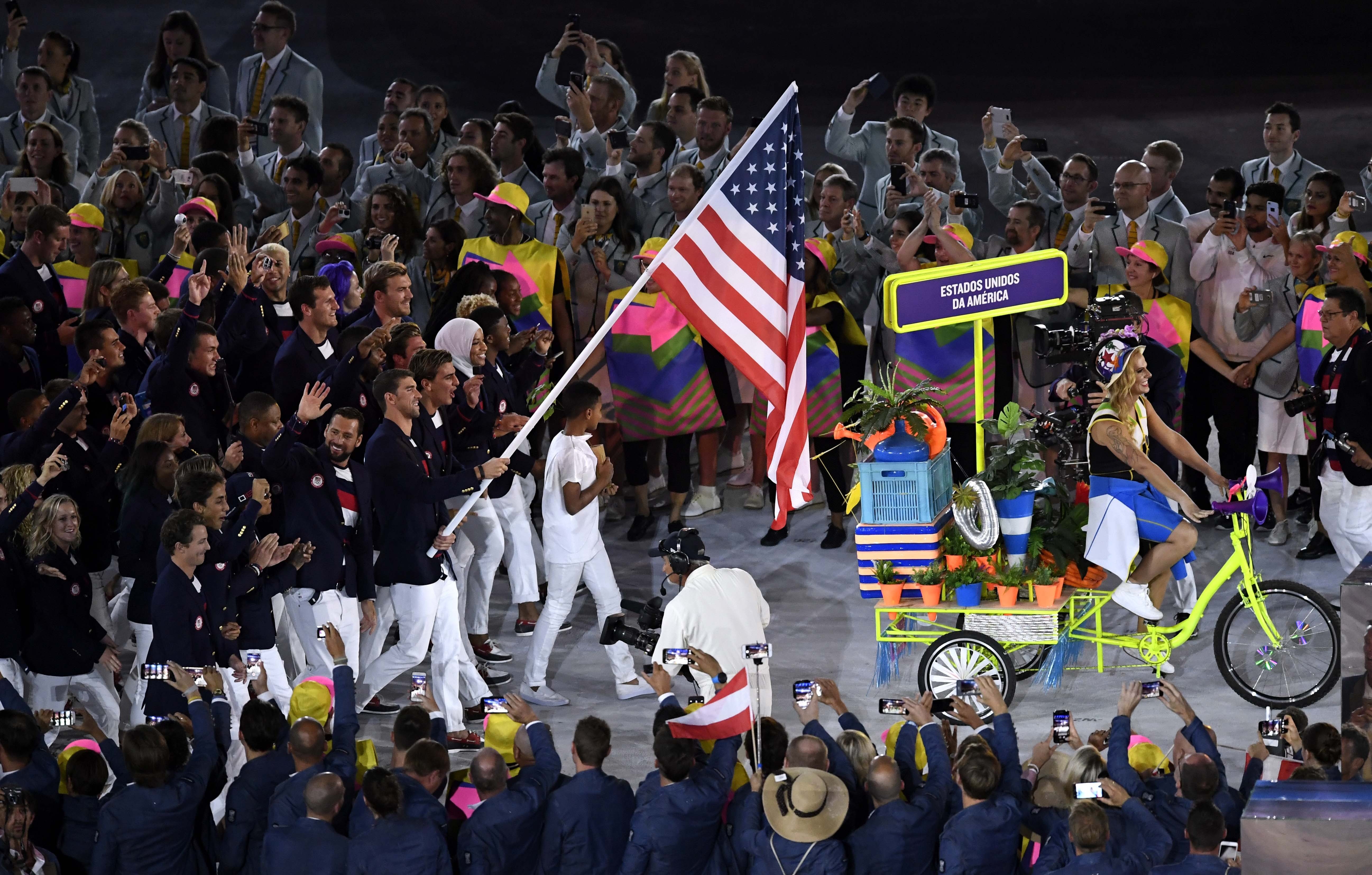 The delegation of the United States parade into Maracana Stadium during the opening ceremony of the 2016 Rio Olympic Games in Rio de Janeiro, Brazil, on Aug. 5, 2016. (Xinhua/Qi Heng)