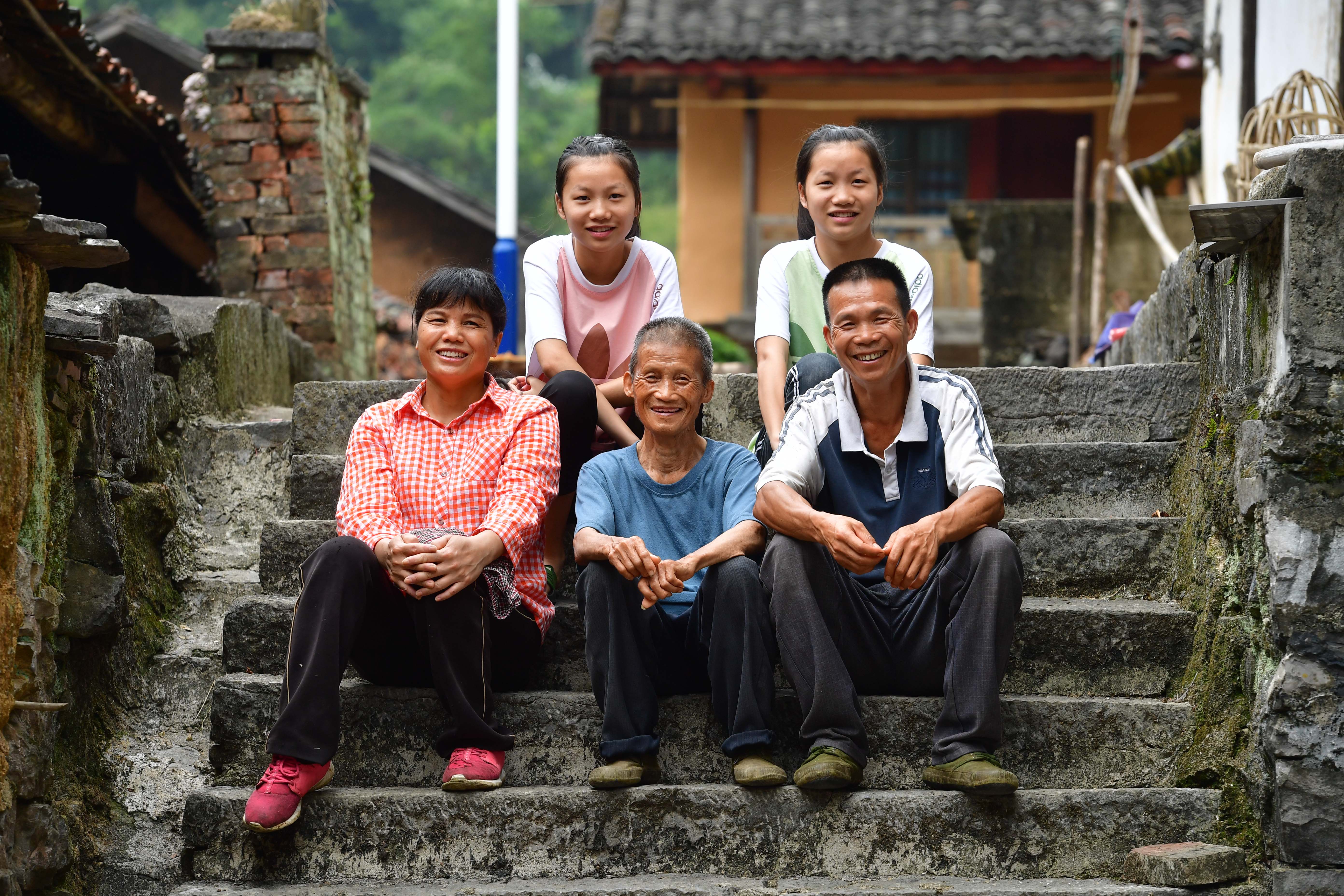 Family portrait of Long Gexiong (1st R, front) at Tongbantun Village of Dongqi Township in Rongan County, south China's Guangxi Zhuang Autonomous Region. (Xinhua/Huang Xiaobang)