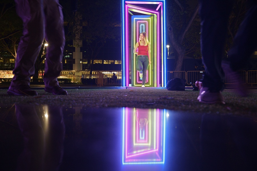 Along the way, visitors are greeted by the Stamford Court clock tower decked in bright and tropical visuals in a playful animated projection, a disco walkway, a Glow Away installation filled with gooey, slippery UV-activated slime and a magical rainforest full of illuminated trees.