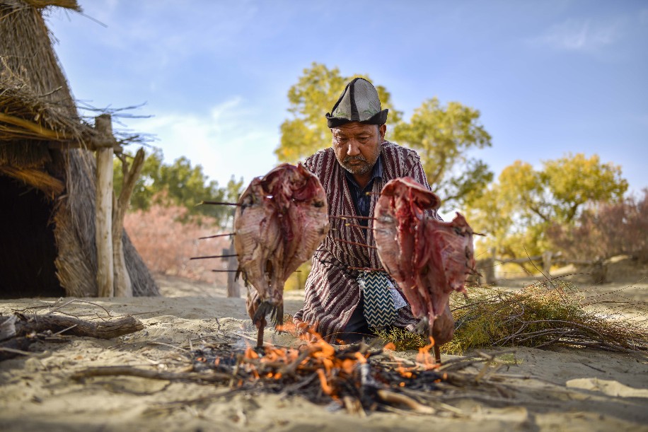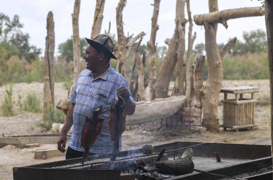 During the peak tourist season from June to October, Amudun grills fish with his secret sauce, and in the off-season, he makes handicrafts with desert poplar wood to sell when the tourists return.