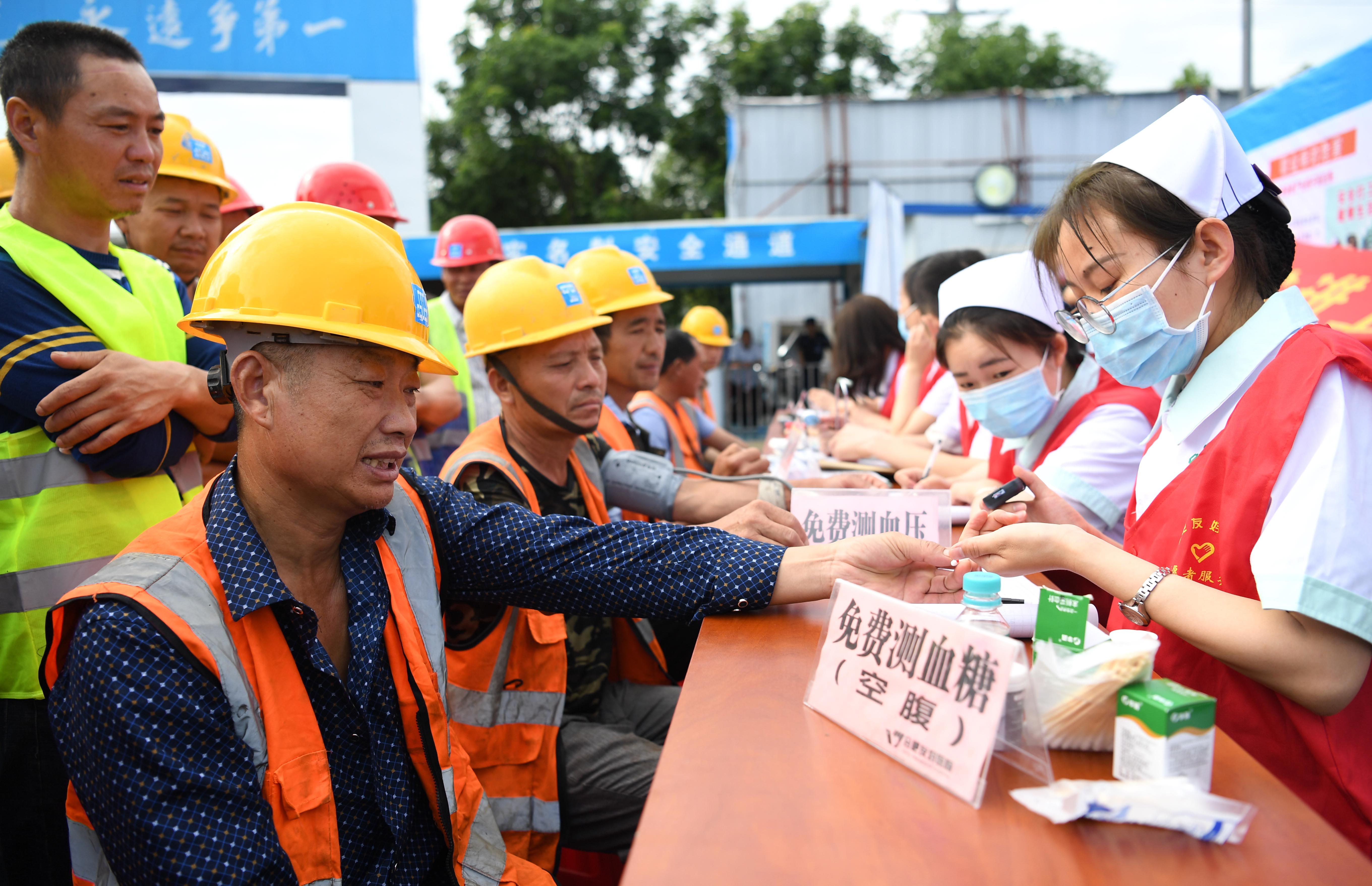 Medical workers perform physical examination for migrant workers on a construction site in Hefei, east China's Anhui Province, June 6, 2019. (Xinhua/Liu Junxi)