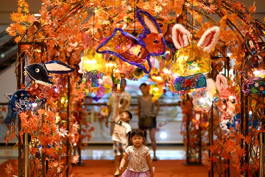 Customers walk in a mall decorated with lanterns which are used to celebrate the upcoming Chinese traditional Mid-Autumn Festival in Kuala Lumper, Malaysia, Step. 2, 2019. (Photo by Chong Voon Chung/Xinhua)■