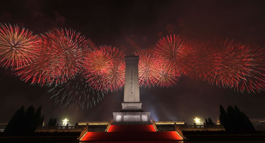 Fireworks explode during a grand evening gala marking the 70th founding anniversary of the People's Republic of China (PRC) in Beijing, capital of China, Oct. 1, 2019. (Xinhua/Zhang Hongxiang)