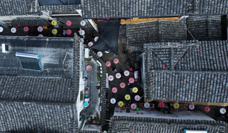 Aerial photo shows people visiting the Longmen ancient town at Fuyang District in Hangzhou, east China's Zhejiang Province, on Oct. 2, 2019, the second day of the 7-day-long National Day holiday. (Xinhua/Xu Yu)