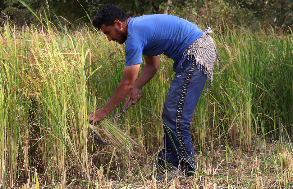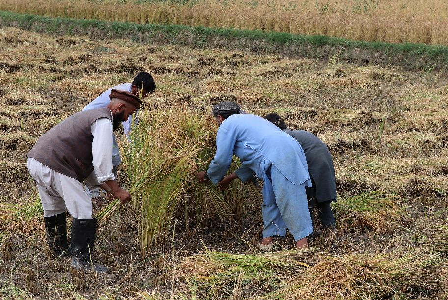 Afghan farmers harvest rice in paddy field