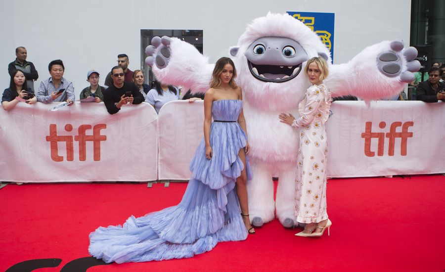 Actresses Chloe Bennet (L, Front) and Sarah Paulson (R, Front) pose for photos with costumed Yeti before the world premiere of the film "Abominable" during the 2019 Toronto International Film Festival (TIFF) in Toronto, Canada, on Sept. 7, 2019. (Photo by Zou Zheng/Xinhua)