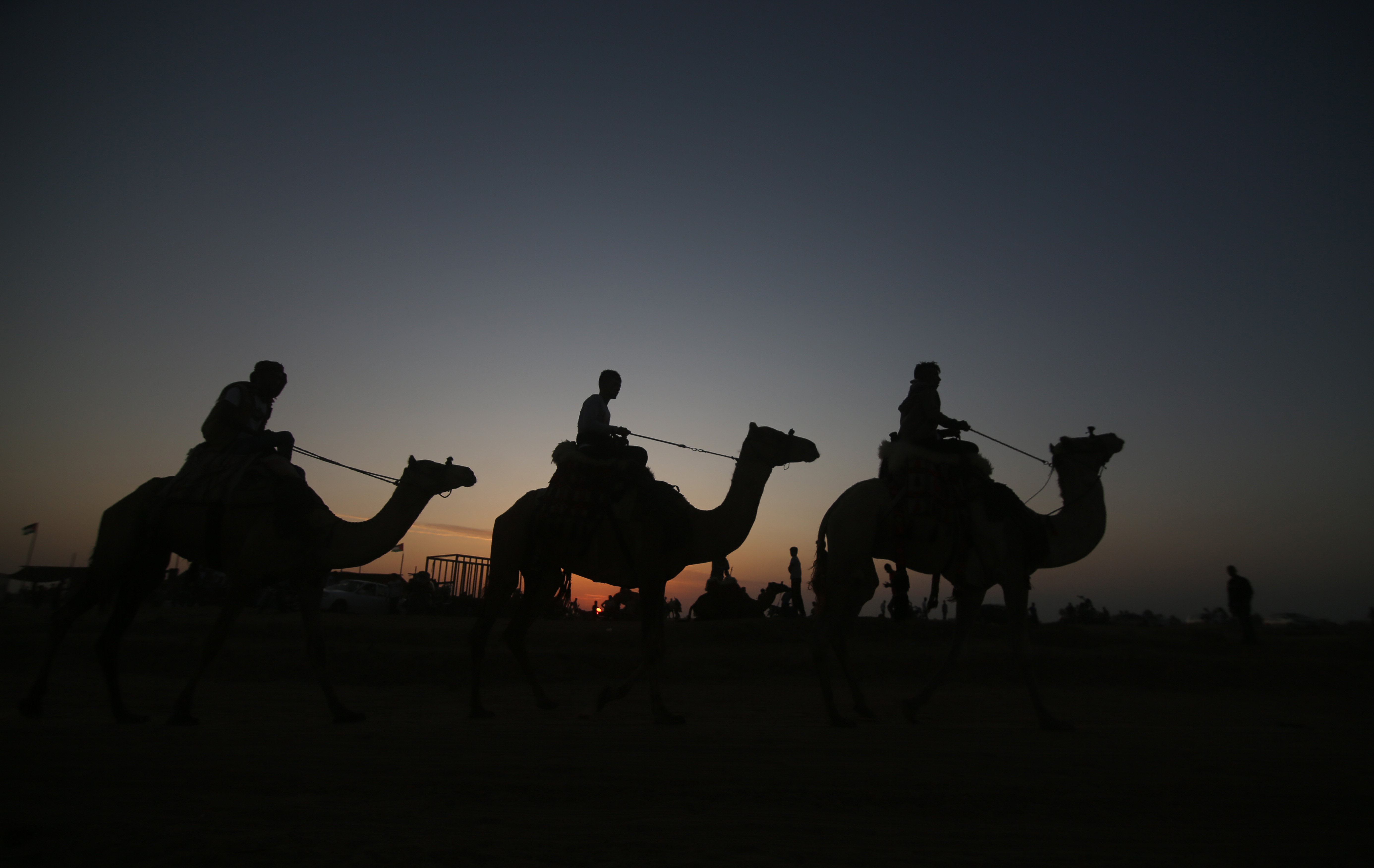 Palestinian jockeys take part in a traditional camel race during Rafah Camel Festival, held in the southern Gaza Strip city of Rafah, Oct. 20, 2019. (Photo by Khaled Omar/Xinhua)