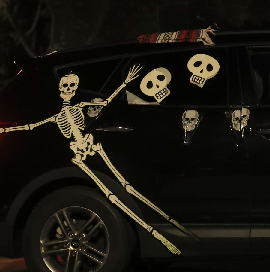 Skeleton props are displayed during Anaheim Halloween Parade, Oct. 26, 2019. (Xinhua/Li Ying)