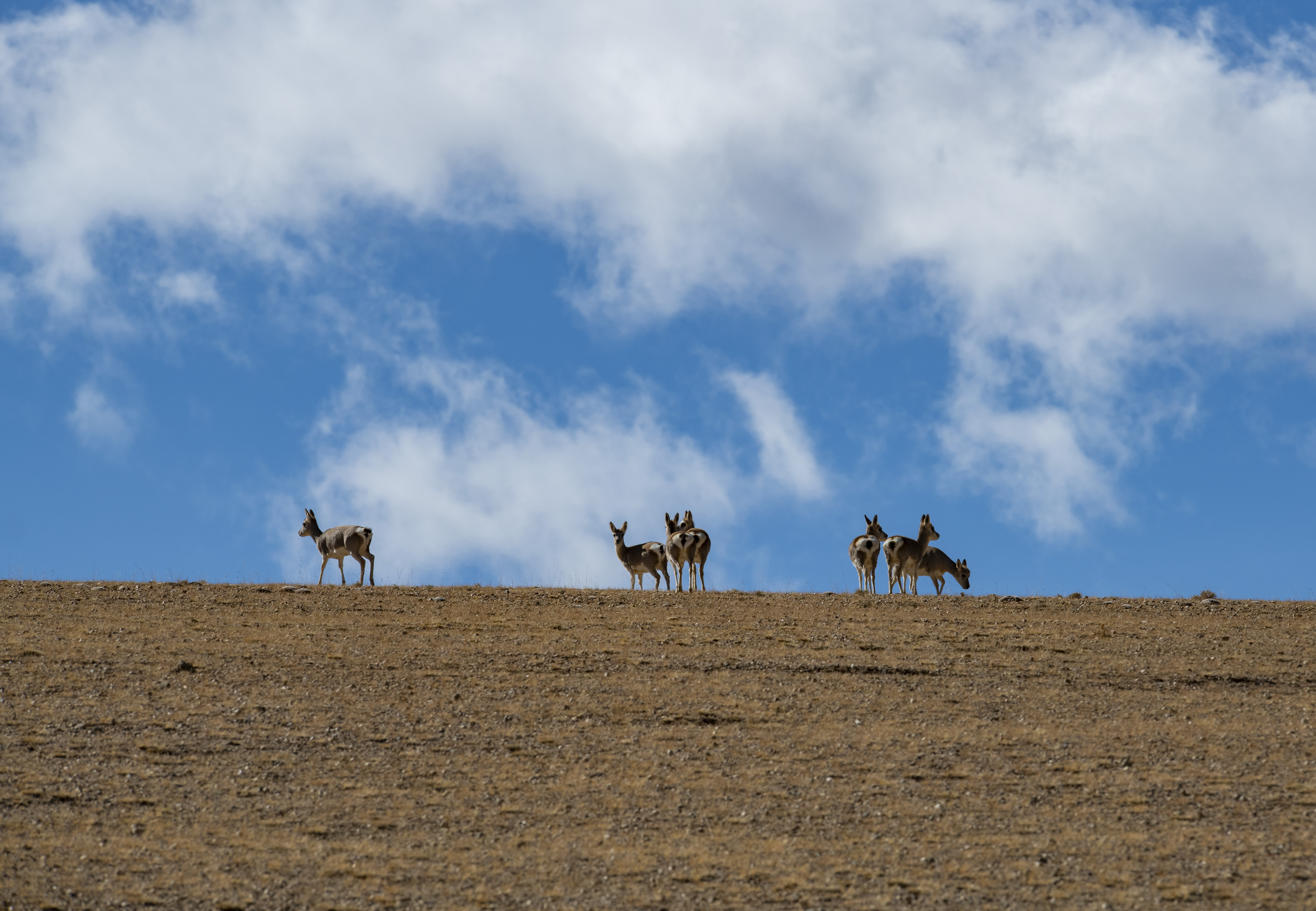 Photo taken on Oct. 31, 2019 shows a flock of Tibetan antelopes near Baiku Co (Baiku Lake), southwest China's Tibet Autonomous Region. (Xinhua/Sun Fei)