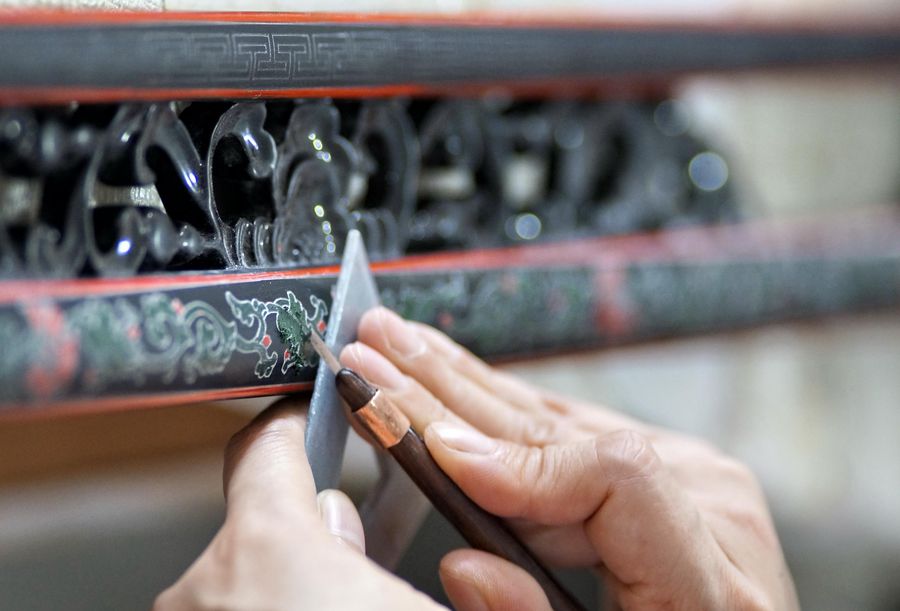 A technician works on a lacquer painting at Beijing Gold Lacquer Inlaid Co., Ltd. in Beijing, capital of China, Oct. 31, 2019. (Xinhua/Li Xin)