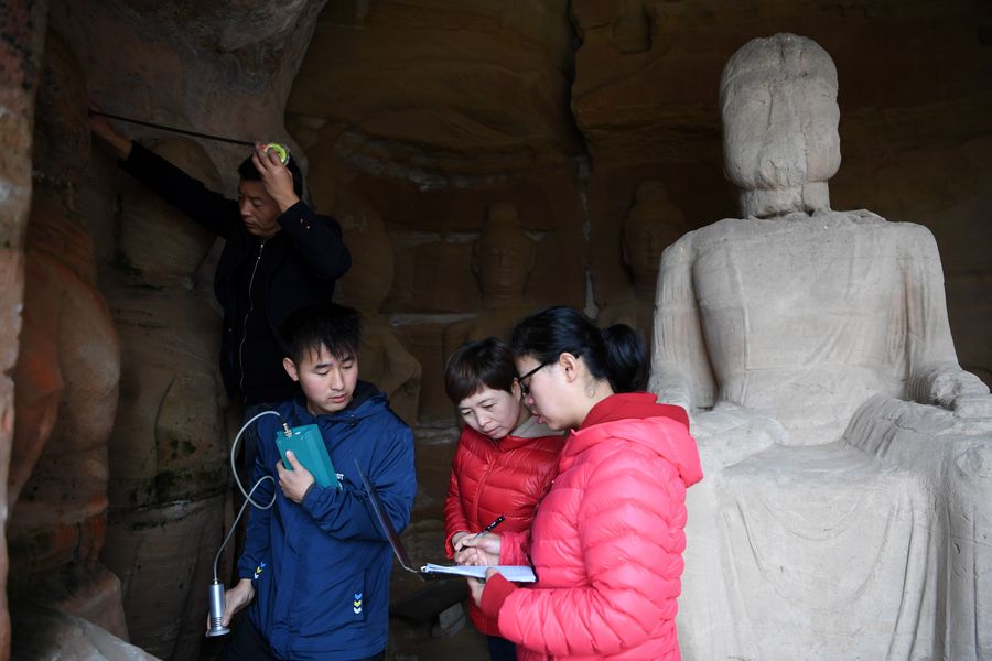 Cultural relic conservation experts conduct moisture content tests inside Cave 267 of the North Grotto Temple in Qingyang, northwest China's Gansu Province, Nov. 5, 2019. (Xinhua/Ma Ning)