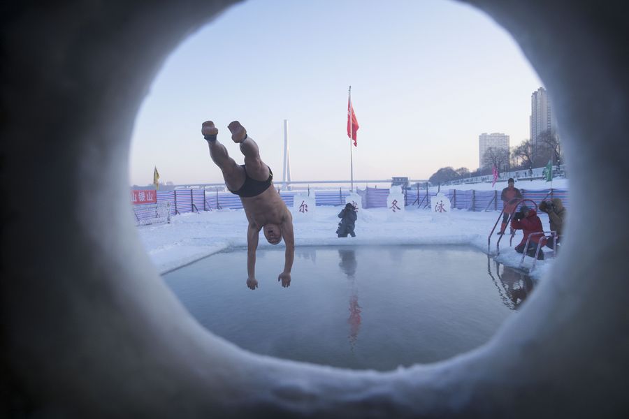 A winter swimmer jumps into the pool in Harbin, capital of northeast China's Heilongjiang Province, Jan. 1, 2020. (Xinhua/Zhang Tao)