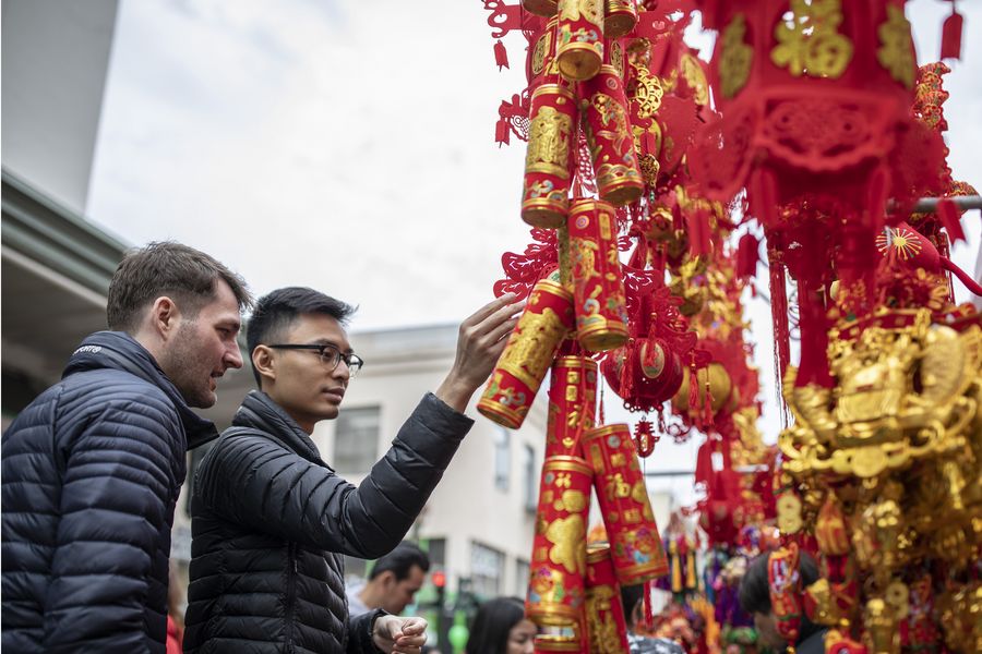 Visitors select decorative items at a Spring Festival fair at the Chinatown in San Francisco, the United States, Jan. 19, 2020. (Photo by Li Jianguo/Xinhua)