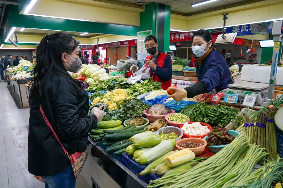 A woman buys vegetables at a market in Nanjing, east China's Jiangsu Province, Feb. 2, 2020. (Xinhua/Li Bo)