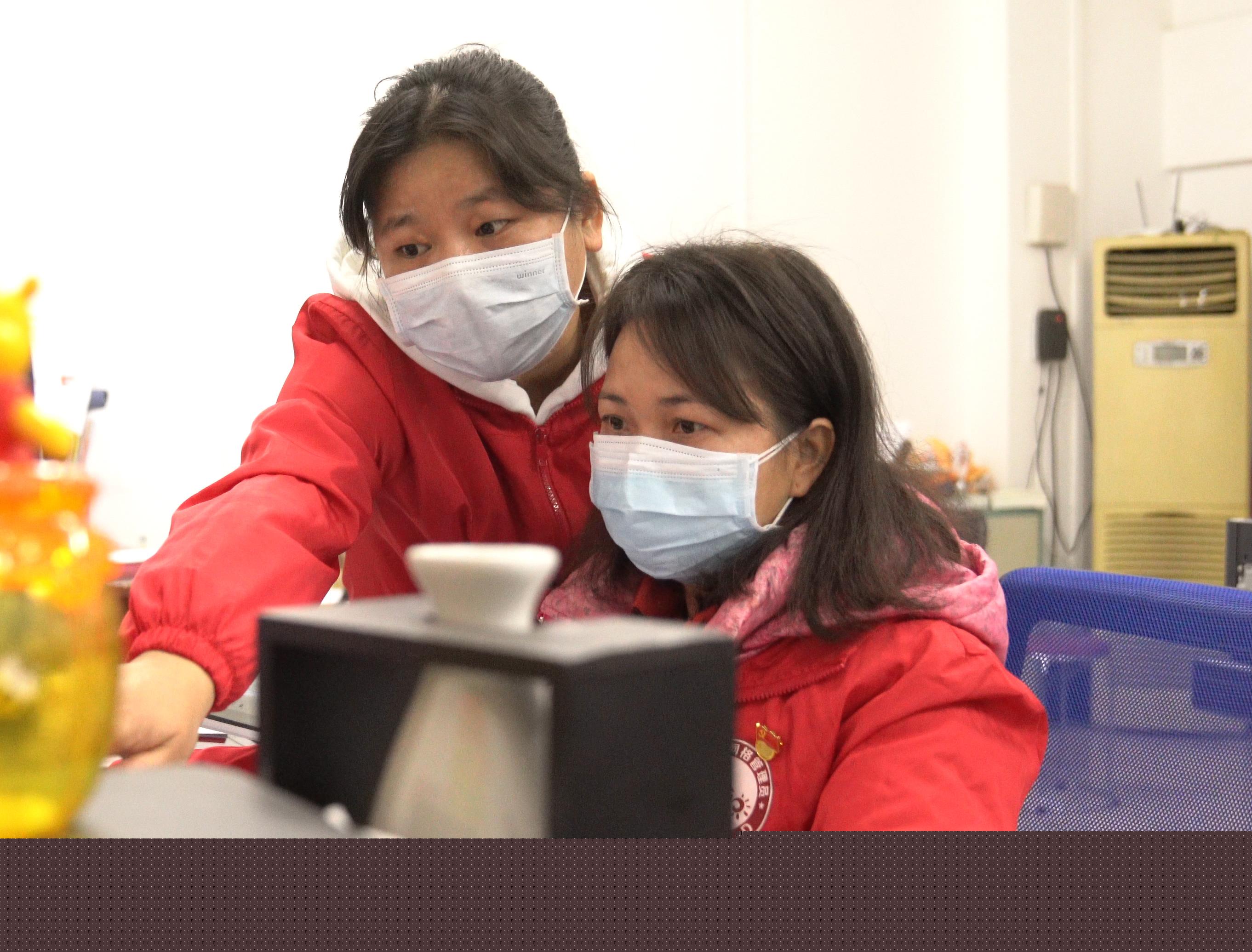 Grid-based community workers Huang Juan (L) and Peng Ying discuss prevention and control work of the novel coronavirus in Nanning, south China's Guangxi Zhuang Autonomous Region, Jan. 31, 2020. (Xinhua/Chen Yifan)