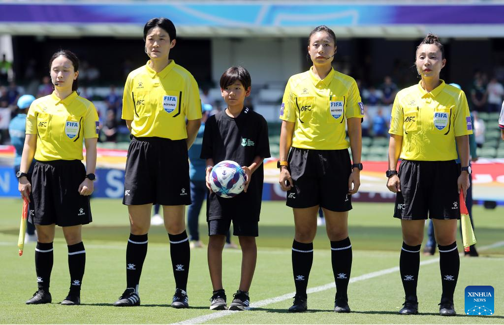 Fourth official Dong Fangyu (2nd L) is seen before the Group C match of Women's Asian Cup between Chinese Taipei and Japan in Perth, Australia, March 4, 2026. (Photo by Zhou Dan/Xinhua)
