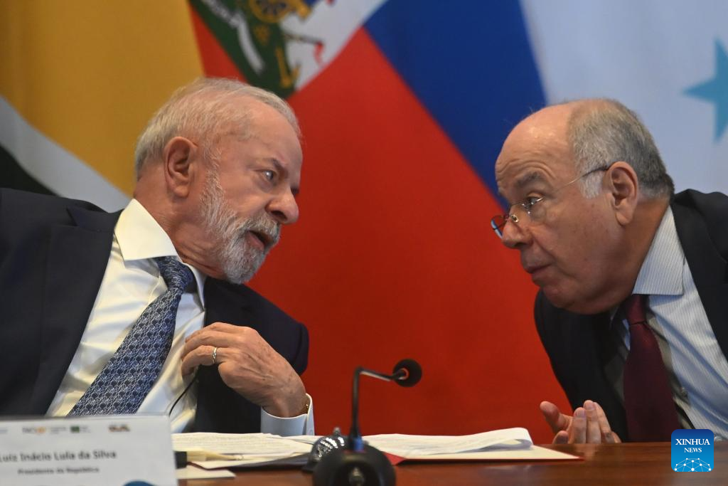 Brazilian President Luiz Inacio Lula da Silva (L) and Brazilian Foreign Minister Mauro Vieira talk at the 39th Regional Conference of the Food and Agriculture Organization of the United Nations for Latin America and the Caribbean in Brasilia, Brazil, March 4, 2026. Lula on Wednesday criticized prioritizing military spending over food security, asserting that hunger eradication is an attainable goal hindered by a "lack of commitment." (Photo by Lucio Tavora/Xinhua)