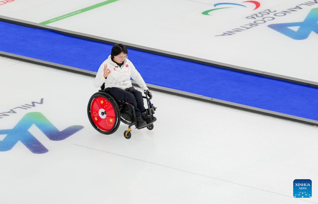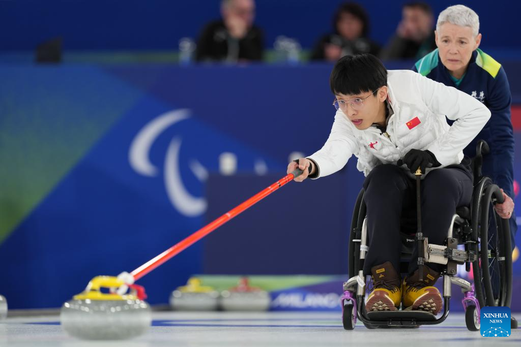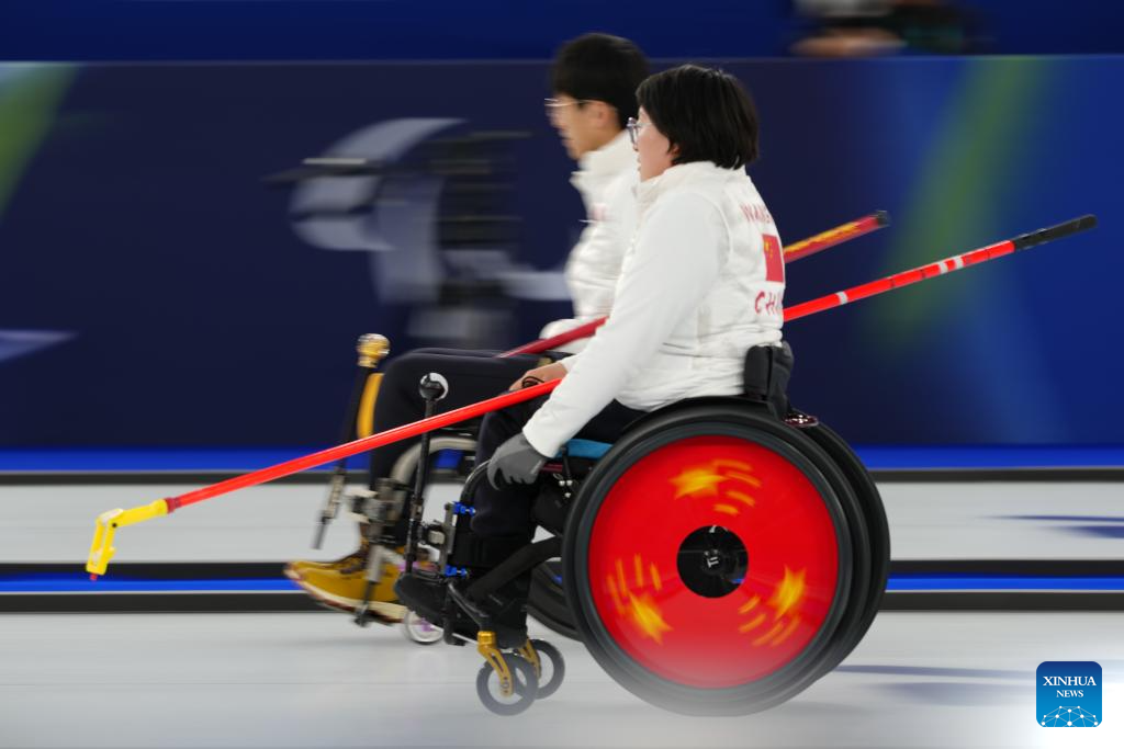 CORTINA D'AMPEZZO, Italy, March 4 (Xinhua) -- China's Wang Meng and Yang Jinqiao beat Japan's Aki Ogawa and Yoji Nakajima 10-3 in the opening round-robin session on Wednesday as the wheelchair curling mixed doubles began at the Milan-Cortina 2026 Paralympic Winter Games.