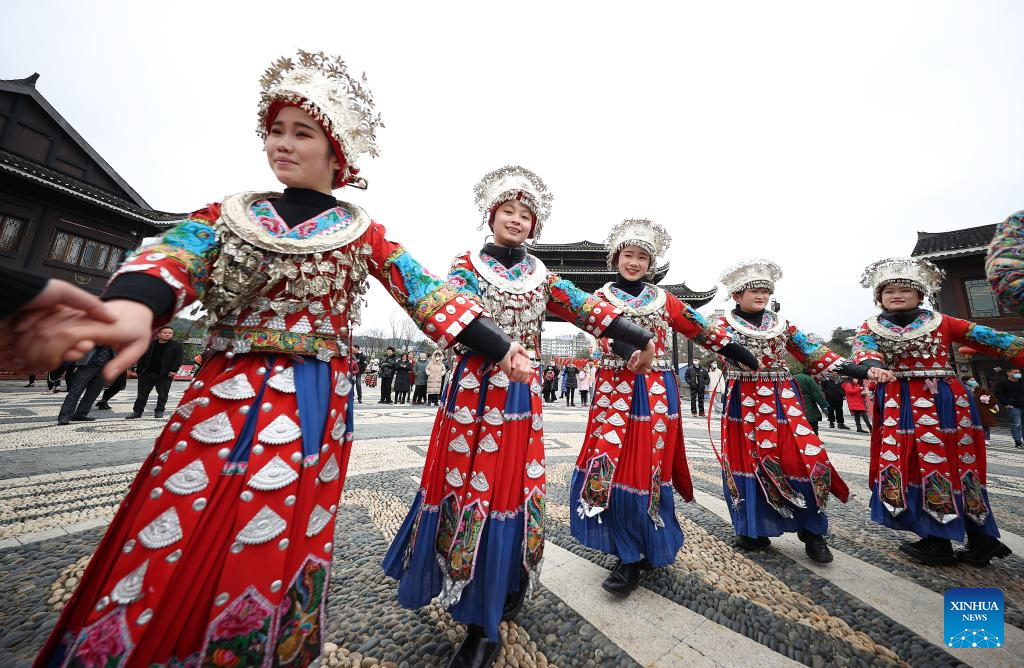 People of Miao ethnic group dance at Wanda Town of Danzhai County in Qiandongnan Miao and Dong Autonomous Prefecture, southwest China's Guizhou Province, Feb. 13, 2022. Various events are held across China to celebrate the upcoming Lantern Festival. (Photo by Huang Xiaohai/Xinhua)